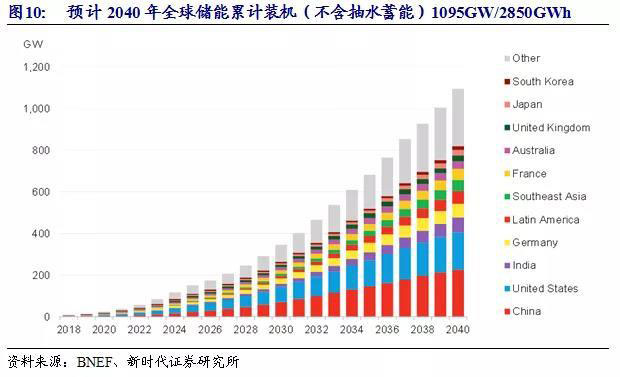 據(jù)CNESA預(yù)測(cè),到2019年底,中國(guó)電化學(xué)儲(chǔ)能累計(jì)裝機(jī)1.89GW,2020年底累計(jì)裝機(jī)2.83GW,到2023年底累計(jì)裝機(jī)19.3GW。根據(jù)BNEF的預(yù)測(cè),到2040年,全球儲(chǔ)能累計(jì)裝機(jī)(不含抽水蓄能)將達(dá)到近1095GW/2850GWh,對(duì)應(yīng)投資6620億美元。我們認(rèn)為,抽水蓄能以外的電力儲(chǔ)能,特別是容量型儲(chǔ)能,未來(lái)將以電化學(xué)儲(chǔ)能為主。