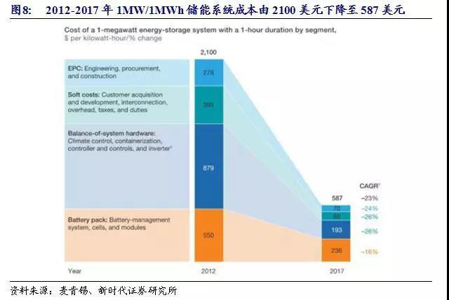 系統(tǒng)成本不斷下降,儲(chǔ)能經(jīng)濟(jì)性拐點(diǎn)開(kāi)始出現(xiàn)。除電池成本外,由BMS(電池管理系統(tǒng))、PCS(儲(chǔ)能變流器)和施工成本構(gòu)成的BOS成本也在快速下降。根據(jù)麥肯錫數(shù)據(jù),2012年至2017年,儲(chǔ)能系統(tǒng)中電池以外的成本(BOS成本)由1500美元/MWh下降至351美元/MWh,平均每年降幅超過(guò)25%。