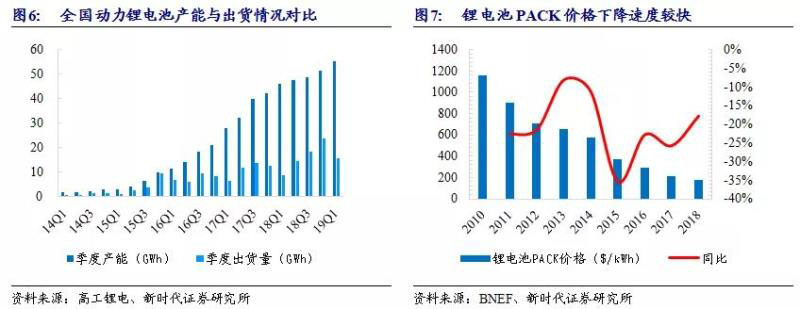動(dòng)力電池產(chǎn)業(yè)成熟推動(dòng)鋰電池價(jià)格持續(xù)下降。截至2018年底,國(guó)內(nèi)動(dòng)力電池產(chǎn)能超過(guò)206GWh,全年國(guó)內(nèi)動(dòng)力電池出貨量?jī)H為65.03GWh。從結(jié)構(gòu)上看,隨著新能源汽車應(yīng)用上三元電池的優(yōu)勢(shì)逐步確立,磷酸鐵鋰電池產(chǎn)能過(guò)剩相對(duì)更為嚴(yán)重。動(dòng)力電池產(chǎn)業(yè)鏈的成熟與產(chǎn)能過(guò)剩,未來(lái)將進(jìn)一步推動(dòng)鋰電池價(jià)格持續(xù)下降。