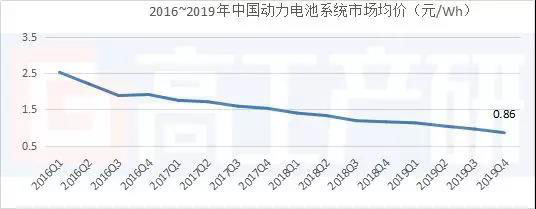 市場出現(xiàn)增量不增值的原因主要由于電池單體以及系統(tǒng)價格下降速度遠大于電池單體出貨量增加速度。從季度價格走勢分布來看,2016-2019年整體價格呈現(xiàn)4%-10%不等的下降走勢,2019年電池單體價格下降走勢維持在5%-10%之間,較2018年下降幅度更大。2019年4季度動力電池系統(tǒng)不含稅價格為0.82~0.95元/Wh,較2018年4季度動力電池系統(tǒng)價格下降25.9%。GGII預(yù)測,2020年隨著電池系統(tǒng)集成化提升以及新工藝的使用,動力電池價格有望進一步下降。