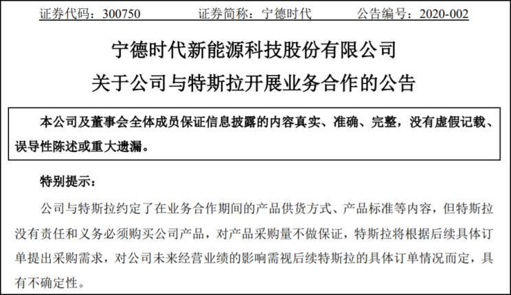 寧德時代與特斯拉合作的傳聞起始于2019年11月,知情人士稱雙方已達成初步協(xié)議,寧德時代最早或于2020年開始為上海工廠供應(yīng)電池。不過彼時特斯拉和寧德時代均拒絕回應(yīng)上述消息。2020年1月30日,特斯拉在2019年第四季度財報的電話會議中首次公開明確,寧德時代將成為其合作伙伴,具體細節(jié)將在4月的“電池日”中進一步透露。