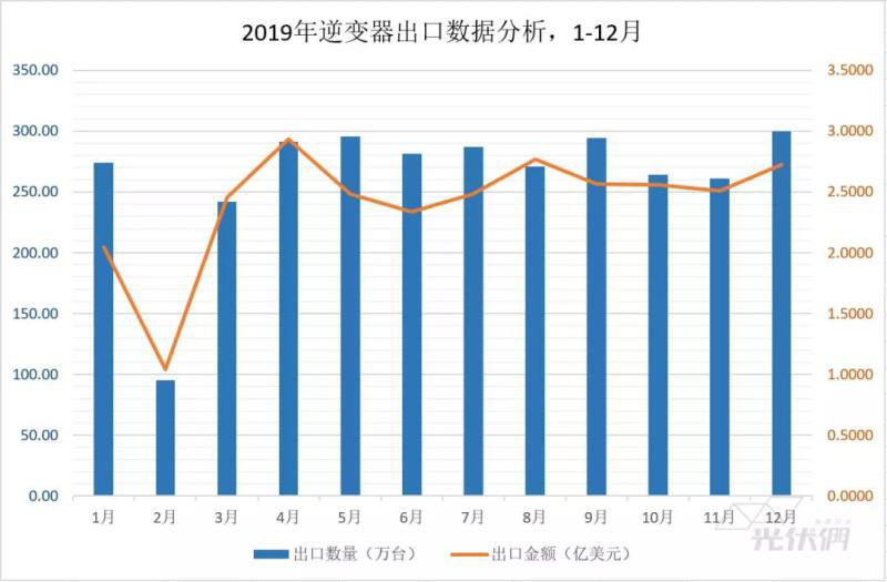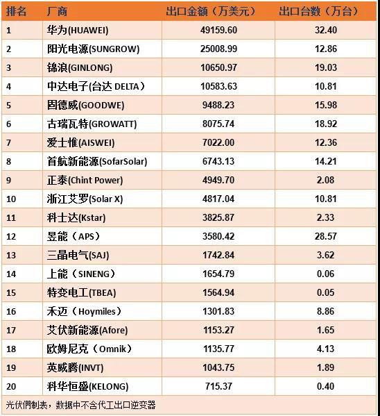近日,2019年全年的海關(guān)數(shù)據(jù)已出爐,根據(jù)光伏們統(tǒng)計(jì),2019年全年,中國(guó)的逆變器出口量約為3155.47萬(wàn)臺(tái),出口總金額達(dá)到了近29億美元(含光伏、風(fēng)電、汽車(chē)電源等),前20家光伏逆變器公司的出口金額超過(guò)了總出口額的50%,約為15.42億美元。其中華為、陽(yáng)光,錦浪,臺(tái)達(dá),固德威位列2019年出口逆變器企業(yè)前五名。
