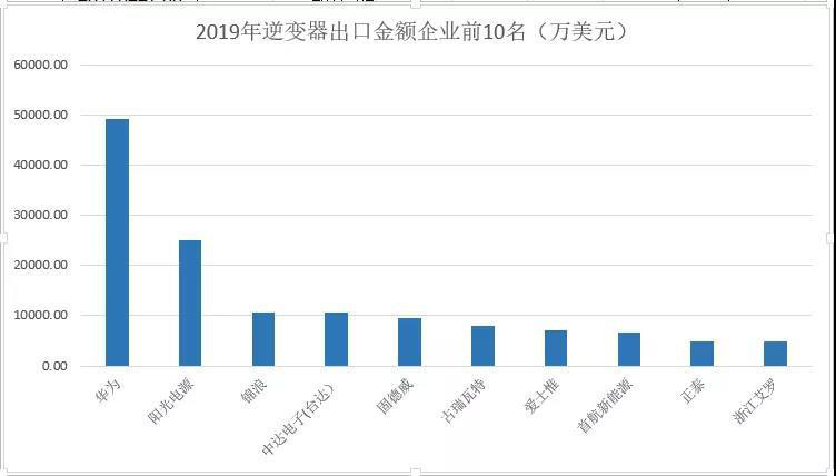 通過(guò)上表可以看出,在排名前20的逆變器企業(yè)中,出口金額排序變化不大,前三甲與2018年相同,華為、陽(yáng)光、錦浪依舊領(lǐng)跑,而前四名的企業(yè)出口金額均已超過(guò)1億美元,頭部企業(yè)的集中趨勢(shì)明顯。從具體數(shù)字來(lái)看,華為以絕對(duì)優(yōu)勢(shì)領(lǐng)跑整個(gè)榜單,以4.9億美元、16.9%的占比,超過(guò)第二位8.3個(gè)百分點(diǎn),位于第二位的陽(yáng)光電源與第三位的錦浪科技,出口金額占比相差近5個(gè)百分點(diǎn)。