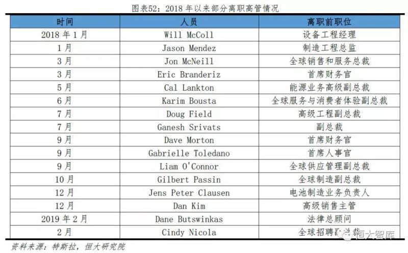 五、高層震蕩頻繁。特斯拉高層離職率呈增長(zhǎng)趨勢(shì),僅2018年全年,離職高管超過40人。除正常的人員調(diào)動(dòng)和行政方面高管離職,特斯拉核心團(tuán)隊(duì)的技術(shù)、財(cái)務(wù)、研發(fā)、法務(wù)管理人員均發(fā)生過離職,例如2016年5月離職的生產(chǎn)制造副總裁Greg Reichow與Josh Ensign、2017年4月離職的首席財(cái)務(wù)官JasonWheeler、2017年7月離職的電池技術(shù)總監(jiān)Kurt Kelty、2018年9月離職的首席人事官Gabrielle Toledano等。即便高管離職跳槽在硅谷科創(chuàng)企業(yè)非常普遍,但是管理層頻繁變動(dòng)仍不利于特斯拉穩(wěn)健發(fā)展。