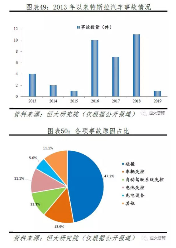 三、安全問題。即便對(duì)產(chǎn)品經(jīng)過多次升級(jí)、采取各種安全措施,特斯拉汽車事故頻率依然呈上升趨勢(shì),2013年因頻發(fā)的汽車起火事件導(dǎo)致特斯拉股價(jià)跌幅最高達(dá)20%。根據(jù)已披露報(bào)道,從2013年至2019年3月特斯拉共發(fā)生36起汽車安全事故,47.2%為車輛碰撞導(dǎo)致,其中包括因?yàn)榫岂{、操作不當(dāng)、路障等而造成的碰撞。然而,不同于燃油車,58.8%車輛碰撞引發(fā)電池燃燒,且由于動(dòng)力電池高燃燒時(shí)長(zhǎng),對(duì)駕駛員造成不同程度傷害。此外,事故傷亡程度深,36起事故中有9起事故造成人員死亡。