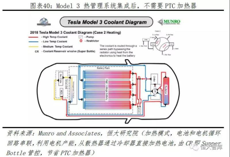四、熱管理系統(tǒng)溫差設(shè)計(jì)合理,冷卻路線豐富流暢,均溫和能量管控能力突出。新能源汽車的熱管理系統(tǒng)主要包括整車、座艙、電池三方面,進(jìn)行整車溫度控制、客艙空調(diào)加熱制冷、電池過熱散熱過冷加熱等。目前,主流熱管理包括自然冷卻、液冷和直冷三種方案,特斯拉采取50%水和50%乙二醇為冷卻液的液冷方案,由四通閥實(shí)現(xiàn)的電機(jī)和電池冷卻循環(huán)串并聯(lián)結(jié)構(gòu)。由系統(tǒng)芯片算法控制,當(dāng)電池溫度超過設(shè)定目標(biāo)值時(shí),電池循環(huán)與電機(jī)循環(huán)相互獨(dú)立,采用并聯(lián);電池溫度低于設(shè)定目標(biāo)值時(shí),電池循環(huán)與電機(jī)循環(huán)采取串聯(lián),利用電機(jī)余熱為電池和座艙加熱,多余熱量將由進(jìn)氣口的熱量交換器排放出去。此方案充分利用車內(nèi)所有部件熱量,使熱量有效循環(huán)游走,極大提高電池單體散熱性和電池單體間溫度一致性。因此,無論冬季還是夏季所對(duì)應(yīng)的極端氣候,特斯拉車輛溫差控制保持在2℃內(nèi),體現(xiàn)強(qiáng)大的溫度管控能力。