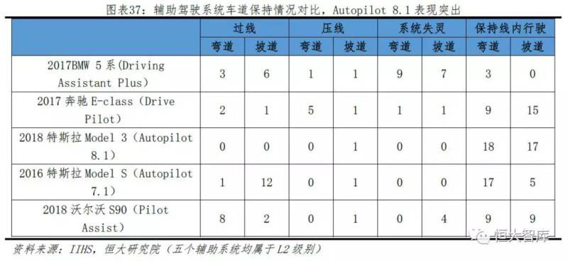 從車道保持情況來看,根據(jù)美國(guó)公路安全保險(xiǎn)協(xié)會(huì)IIHS數(shù)據(jù),在直徑1300-2000英尺(396-617米)不同的空曠道路測(cè)試環(huán)境下,對(duì)比寶馬5系、奔馳E、Model 3/S和沃爾沃S90五輛同類別轎車,設(shè)定3種情況各6種測(cè)試的共18次測(cè)試條件,Autopilot8.1輔助駕駛系統(tǒng)在彎道和坡道的車輛保持能力最為突出,僅在坡道表現(xiàn)過一次壓線。