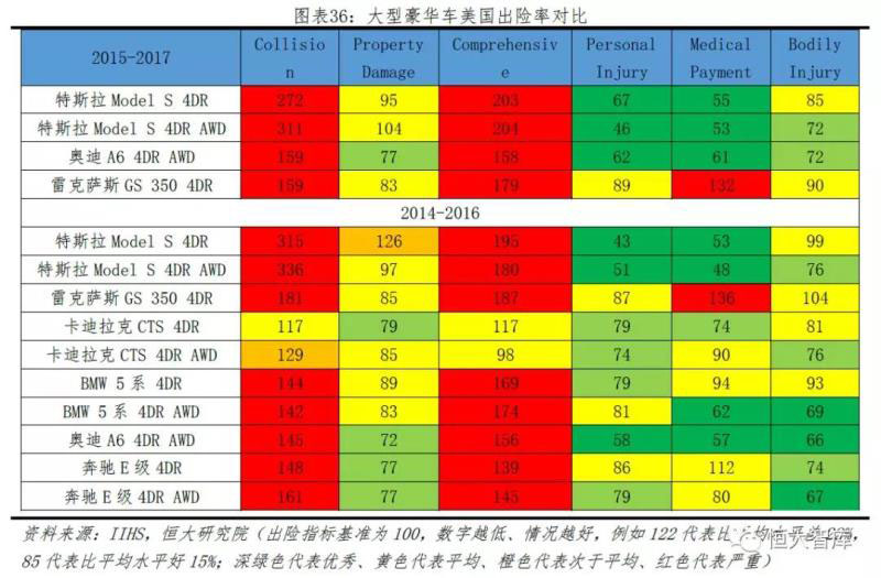對(duì)比同等大型豪華轎車的出險(xiǎn)率,從三項(xiàng)車體保護(hù)險(xiǎn)來看,特斯拉與其他豪華轎車類似,表現(xiàn)較差,且數(shù)據(jù)遠(yuǎn)遠(yuǎn)高于其他同類型轎車,說明特斯拉單車平均碰撞率高于行業(yè)平均水平,這也暗示由于系統(tǒng)誤判或者駕駛員忽視容易造成更多碰撞。但從三項(xiàng)人體保護(hù)險(xiǎn)來看,特斯拉Model S低于平均、基本處于優(yōu)秀水平,說明Model S對(duì)自身車主和對(duì)方車主有良好的人身保護(hù)。