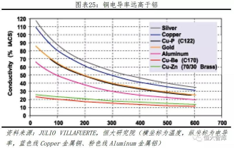 銅較鋁帶來更高的電導(dǎo)效率。從各項(xiàng)金屬不同溫度下的電導(dǎo)率來看,在相同溫度下,銅的電導(dǎo)率遠(yuǎn)高于鋁。如果將電機(jī)轉(zhuǎn)子結(jié)構(gòu)原材料換成銅,電機(jī)工作效率將大大提高。