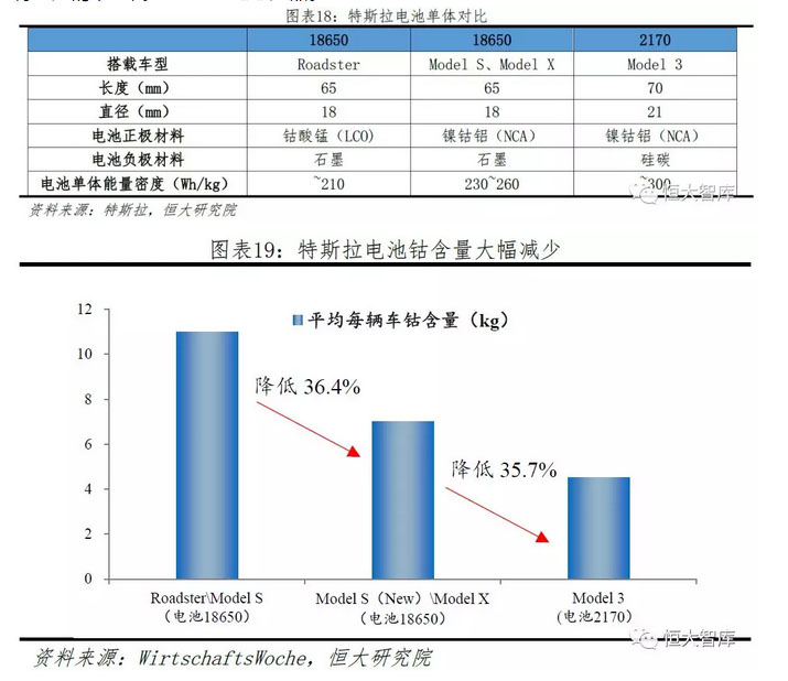 一、不斷尋找最優(yōu)材料,降低成本、提升性能。電池單體化學(xué)物質(zhì)成分和比例的不同將直接影響電池性能表現(xiàn),三元材料中,鎳主要作用為提高材料整體能量密度,鈷主要作用為穩(wěn)定材料層狀結(jié)構(gòu),提高整體循環(huán)性能。然而,過高的鎳含量會(huì)導(dǎo)致化學(xué)成分不穩(wěn)定,過高的鈷含量會(huì)降低能量和容量,并且由于礦產(chǎn)稀缺性,鈷價(jià)一直居高不下。為此,特斯拉不斷攻克電池材料配比,試圖找到最優(yōu)方案。橫向來看,當(dāng)競(jìng)爭(zhēng)對(duì)手2013年做磷酸鐵鋰電池與NCM111時(shí),特斯拉已經(jīng)開始在Model S上應(yīng)用高能量密度NCA三元電池;當(dāng)競(jìng)爭(zhēng)對(duì)手2017年開始由低鎳材料過渡到NCM622/NCM811高鎳正極材料時(shí),特斯拉已經(jīng)探索更高能量密度的硅碳負(fù)極應(yīng)用,特斯拉在電池技術(shù)的積累使其電池能量密度和整車?yán)m(xù)航里程能領(lǐng)先競(jìng)爭(zhēng)對(duì)手?jǐn)?shù)個(gè)身位??v向來看,特斯拉一直堅(jiān)持使用NCA作為電芯正極材料,并不斷提高鎳含量、降低鈷含量。對(duì)比最新Model 3與Roadster兩款汽車,特斯拉平均每款車鈷含量降低約60%。根據(jù)特斯拉2018年一季度報(bào)告,Model 3的電芯能量密度超過其他任何一款競(jìng)品所使用的電芯,其鈷含量低于主流電芯制造廠即將量產(chǎn)的下一代NCM811電芯產(chǎn)品。