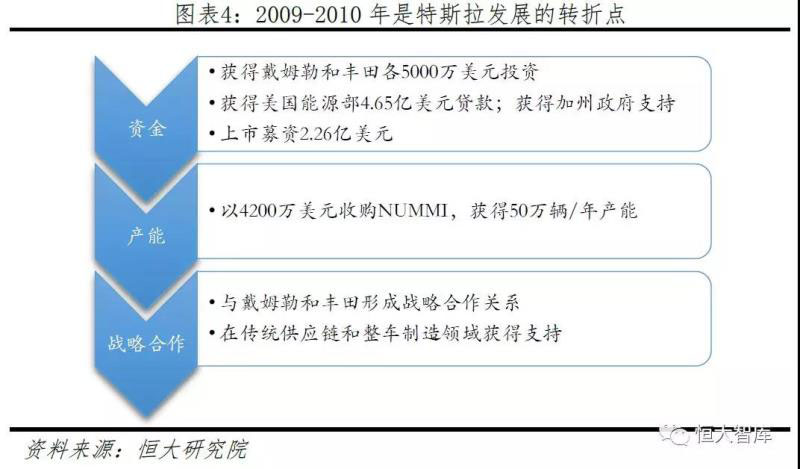 奔馳和豐田的戰(zhàn)略投資使特斯拉獲得資金與品牌雙重背書。2009年1月底特律車展之后,戴姆勒向特斯拉訂購(gòu)了4000顆電池組用于奔馳A-Class車輛測(cè)試,并且以5000萬美元取得了特斯拉10%的股份,形成了合作伙伴關(guān)系。2010年5月特斯拉獲得豐田5000萬美元投資,取得3%股份。與兩家傳統(tǒng)車企巨頭的戰(zhàn)略合作不僅解決了特斯拉資金方面的燃眉之急,更讓特斯拉快速學(xué)習(xí)到生產(chǎn)、管理經(jīng)驗(yàn)和模式的know-how。此外,特斯拉還以4200萬美元低價(jià)收購(gòu)原豐田與通用合資、年產(chǎn)能50萬輛的工廠NUMMI,為大規(guī)模量產(chǎn)打下基礎(chǔ)。