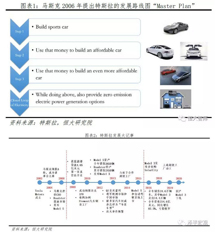 2003年,硅谷工程師艾伯哈德和塔本寧創(chuàng)立電動(dòng)汽車制造公司,為致敬交流電發(fā)明者尼古拉·特斯拉,公司取名為特斯拉(Tesla Motors)。2004年,硅谷新貴馬斯克在特斯拉A輪融資中領(lǐng)投650萬美元,成為特斯拉最大股東和董事長(zhǎng),并在2006年8月提出貫穿特斯拉發(fā)展的路線圖“Master Plan”,即“三步走”戰(zhàn)略: