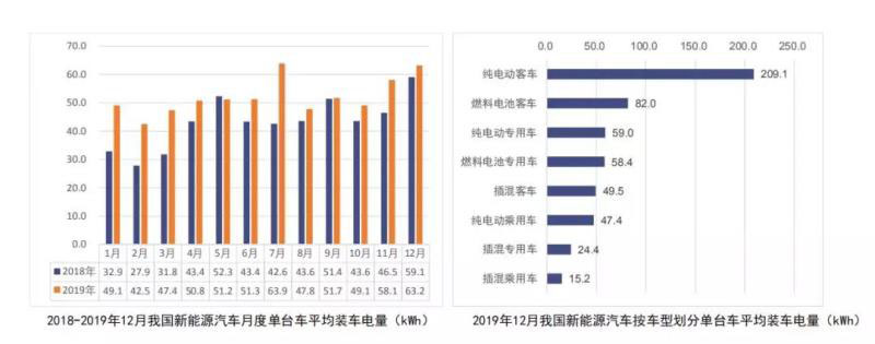 此外,受新能源客車產(chǎn)量大幅上升帶動,2019年12月我國新能源汽車按車型劃分的平均裝車電量63.2kWh,環(huán)比上升8.8%。