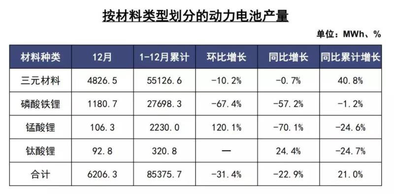 2019年12月,我國動力電池裝車量共計9.7GWh,同比下降27.4%,環(huán)比上升54.4%。其中,三元電池與磷酸鐵鋰電池的裝車量分別為4.8GWh和4.7GWh,同比分別下降28.2%和22.6%。