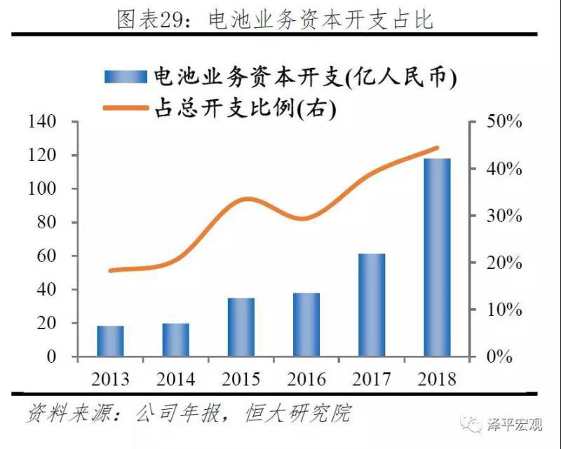 LG Chem高度重視動(dòng)力電池板塊,年資本投入占比超40%。LG Chem為L(zhǎng)G電子集團(tuán)子公司,公司以化學(xué)和材料業(yè)務(wù)起家,1998年開始進(jìn)入鋰電池領(lǐng)域,對(duì)于化學(xué)材料具有深刻的理解,在正極、隔膜、電解液方面具有雄厚的技術(shù)積累。公司積極布局動(dòng)力電池業(yè)務(wù),電池業(yè)務(wù)資本開支逐年提高,2018年超過100億,總開支占比超過40%,動(dòng)力電池帶來的收入占比為23%。