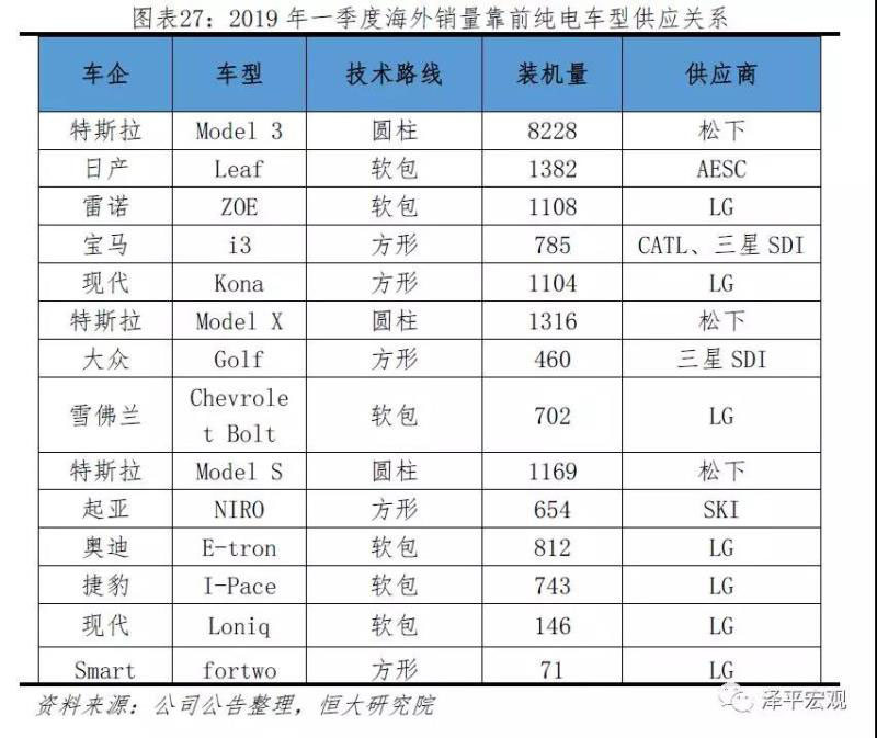 方形和軟包是當(dāng)前以及未來主流封裝方式,圓柱電池較為小眾。國內(nèi)情況來看,寧德時(shí)代、比亞迪等國內(nèi)電池巨頭均選擇方形技術(shù)路線,2018年國內(nèi)裝機(jī)的市場(chǎng)份額方形電池達(dá)到74%。從海外情況來看,由于特斯拉Model 3銷量大增,圓柱電池占比較高達(dá)到了53%。但方形和軟包仍然是車企主流的選擇。2019年一季度海外銷量靠前的十四款車中,除特斯拉采用圓柱方案外,其余6款采用軟包電池、5款采用方形電池。