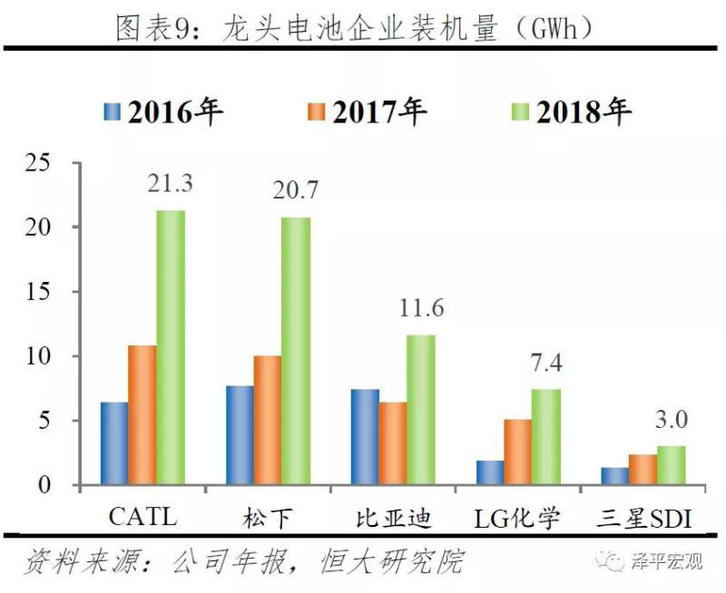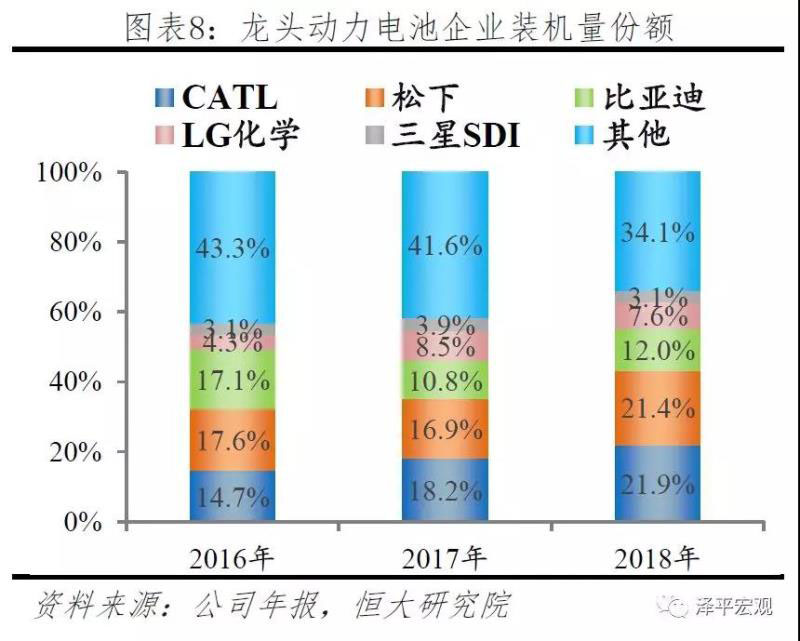 從企業(yè)層面來看,龍頭企業(yè)優(yōu)勢(shì)突出,市占率不斷提高。裝機(jī)量TOP5的企業(yè)市占率不斷提升,由2016年的56.7%上升到2018年65.9%。其中,寧德時(shí)代、松下與LG化學(xué)市場(chǎng)份額占比最高、提升最快,總裝機(jī)量增幅最大。2018年寧德時(shí)代裝機(jī)量21.3GWh,市占率22%;松下裝機(jī)量20.7GWh,市占率21.4%;LG化學(xué)裝機(jī)量7.4GWh,市占率7.6%。前三大企業(yè)在技術(shù)、工藝等領(lǐng)域各具競(jìng)爭(zhēng)優(yōu)勢(shì)。松下是全球最先實(shí)現(xiàn)NCA18650+硅碳負(fù)極圓柱電池量產(chǎn)的企業(yè),在電化學(xué)體系、生產(chǎn)良率與一致性方面居于領(lǐng)先地位;寧德時(shí)代率先實(shí)現(xiàn)了NCM811方形電芯的量產(chǎn),并成功運(yùn)用于廣汽與寶馬,技術(shù)路線上成功實(shí)現(xiàn)由NCM523向NCM811的過渡;LG化學(xué)的優(yōu)勢(shì)在于其對(duì)化學(xué)材料的理解,技術(shù)路線為軟包電池,是國際上最先掌握層壓疊片式軟包的企業(yè),而在NCM811的應(yīng)用上,則落后于寧德時(shí)代。
