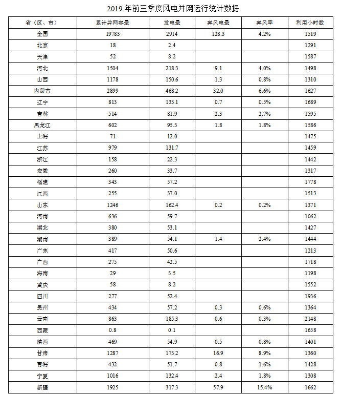 2019年1-9月,平均利用小時數(shù)較高的省份是云南(2148小時)、四川(1936小時)。2019年1-9月,棄風(fēng)仍較為嚴重的地區(qū)是新疆(棄風(fēng)率15.4%、棄風(fēng)電量57.9億千瓦時)、甘肅(棄風(fēng)率8.9%、棄風(fēng)電量16.9億千瓦時)、內(nèi)蒙古(棄風(fēng)率6.6%、棄風(fēng)電量32.0億千瓦時)。