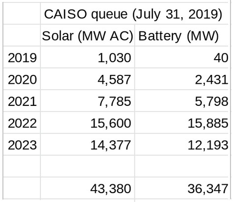 加利福尼亞獨(dú)立系統(tǒng)運(yùn)營(yíng)商(CAISO)的未來(lái)容量中(下圖)包括裝機(jī)容量為43GW的太陽(yáng)能發(fā)電設(shè)施和裝機(jī)容量為36GW儲(chǔ)能系統(tǒng)。但是,大部分是都是獨(dú)立安裝和部署。而且,大多數(shù)項(xiàng)目沒(méi)有提交建設(shè)計(jì)劃。