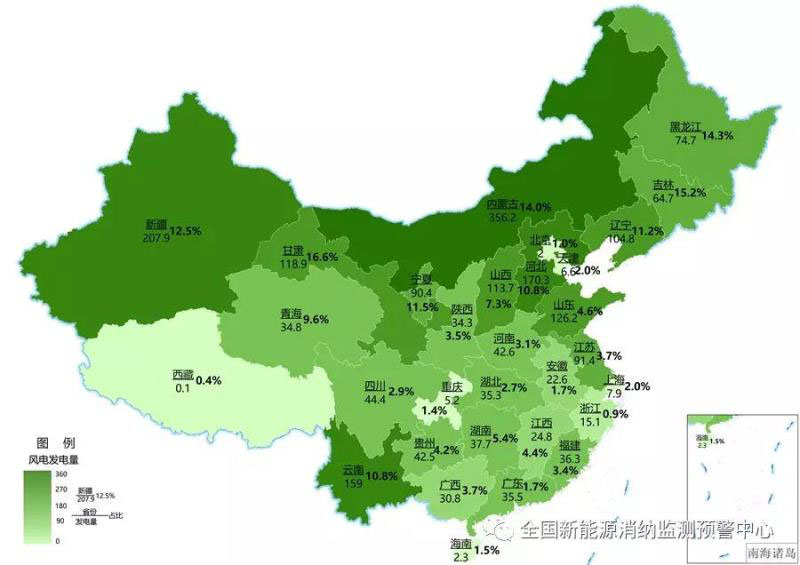 截至6月底各地區(qū)累計風(fēng)電發(fā)電量(億千瓦時)及占本地區(qū)總發(fā)電量比重