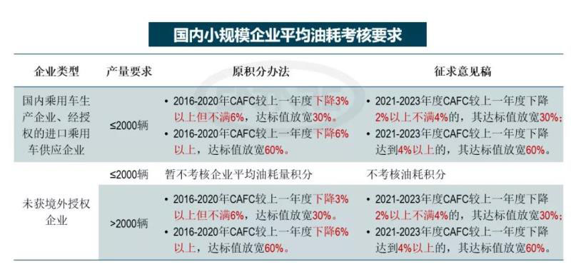 《征求意見(jiàn)稿》中延續(xù)前期做法,對(duì)小規(guī)模企業(yè)繼續(xù)給予了油耗積分的核算優(yōu)惠,對(duì)企業(yè)平均燃料消耗量降幅要求進(jìn)一步放寬。考慮小規(guī)模企業(yè)產(chǎn)品存在結(jié)構(gòu)單一、新能源產(chǎn)品缺乏的特征,在2020年后繼續(xù)降油耗的潛力有限,在油耗下降要求方面給予一定程度的放寬,此舉有利于促進(jìn)我國(guó)汽車市場(chǎng)產(chǎn)品多樣化發(fā)展。