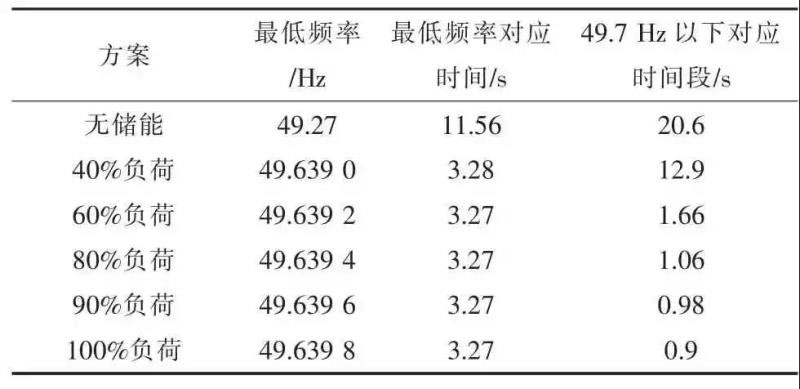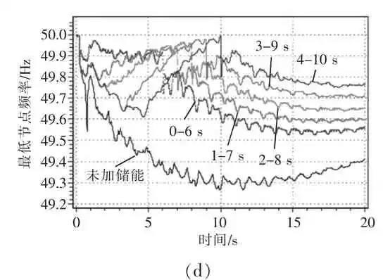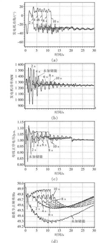 由圖4(a), 4(b), 4(c)可以看出, 儲能裝置的支持對發(fā)電機功角、 功率和母線電壓均有穩(wěn)定作用, 但不同支持時長的效果區(qū)別不是很明顯。圖4(d)顯示, 不同的儲能裝置支持時長對系統(tǒng)最低頻率點的改善效果區(qū)別比較明顯。儲能裝置支持時長較短的, 由于支持能量有限, 頻率在一開始有點回升但較慢, 整個系統(tǒng)頻率是在一次調(diào)頻作用下才回升較快;而儲能裝置支持時長較長的, 頻率在一開始暫升較多些, 這樣推遲了一次調(diào)頻動作時間, 等到儲能裝置放電完成后, 整個系統(tǒng)頻率才在一次調(diào)頻作用下穩(wěn)定回升, 導(dǎo)致系統(tǒng)頻率最低點對應(yīng)的時間有所不同, 處于較低頻率時間較長。從表2 中可以看出, 儲能裝置支持時間為2 s 和10 s 時, 系統(tǒng)頻率低于49.6 Hz 的時間均超過了5 s, 支撐的效果相對較差。而另外支持時長在4~8 s, 反而效果較好, 這是與一次調(diào)頻動作配合比較協(xié)調(diào)所致。因此對于系統(tǒng)頻率穩(wěn)定性來講, 適當(dāng)?shù)膬δ苋萘恐С謺r長比較合適, 不是越長越好。相比于儲能容量支持時長,在大功率缺額的初期, 儲能裝置提供足夠的功率支持對系統(tǒng)最低頻率影響更大。