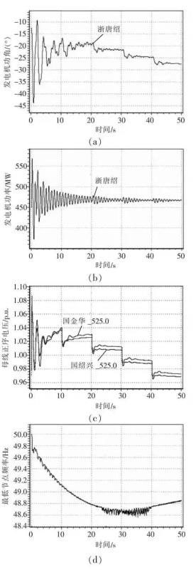 靈紹直流和賓金直流都發(fā)生雙極閉鎖時, 仿真曲線如圖2 所示??梢钥闯?, 當(dāng)靈紹、 賓金2 條直流雙極閉鎖時, 系統(tǒng)功率缺額更大, 浙江電網(wǎng)發(fā)電機功角和功率、 電壓發(fā)生較大波動, 頻率降得更低。但在本身內(nèi)網(wǎng)機組和外網(wǎng)機組一次調(diào)頻作用下, 在經(jīng)過3~4 個一次調(diào)頻時間常數(shù)周期后,最終系統(tǒng)也能夠穩(wěn)定, 系統(tǒng)頻率最低為48.6 Hz,下降到49 Hz 以下, 會導(dǎo)致低頻減載裝置動作。