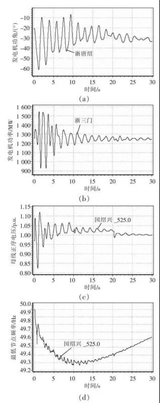 從圖1 可以看出, 靈紹直流雙極閉鎖后, 原來由直流輸送的2×3 900 MW 功率轉(zhuǎn)移到交流線路上, 導(dǎo)致功率波動和頻率下降, 在此過程浙江電網(wǎng)發(fā)電機功角和功率、 電壓均發(fā)生較大的波動,圖1(a)為唐紹發(fā)電機功角曲線、 圖1(b)為三門發(fā)電機功率曲線、 圖1(c)為紹興某變電所500 kV母線正序電壓曲線、 圖1(d)為系統(tǒng)頻率曲線。由于系統(tǒng)的一次調(diào)頻根據(jù)頻率的偏差來啟動, 且慣性時間常數(shù)較大, 一般為4~10 s。從圖1 中可以看出, 浙江電網(wǎng)的一次調(diào)頻時間常數(shù)約為10 s,在本身內(nèi)網(wǎng)機組和外網(wǎng)機組一次調(diào)頻作用下和負荷的調(diào)節(jié)效應(yīng)作用下, 發(fā)電機功率輸出增加, 負荷消耗功率減少, 頻率開始回升, 最終系統(tǒng)能夠穩(wěn)定, 頻率最低為49.27 Hz。