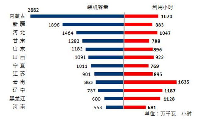 圖5 1-5月份風(fēng)電裝機(jī)較多省份風(fēng)電裝機(jī)容量和設(shè)備利用小時(shí)