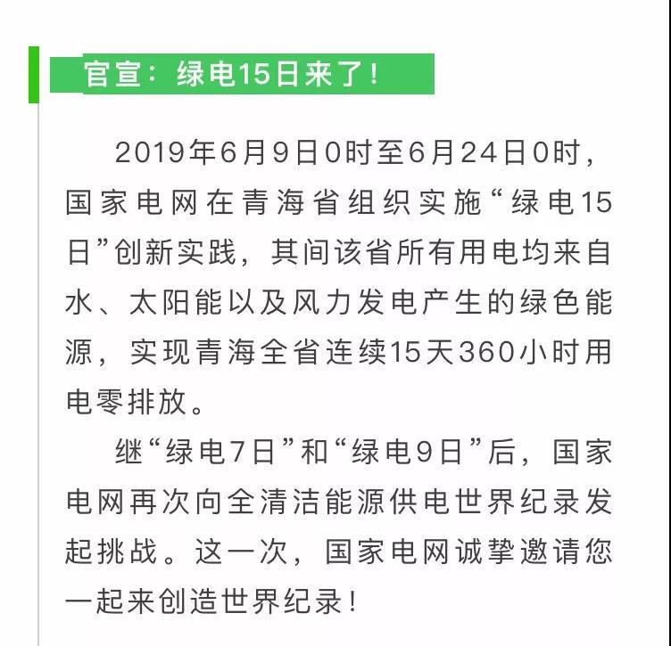 為了讓更多人感知“綠電實(shí)踐”,參與“綠電實(shí)踐”,國(guó)家電網(wǎng)公司在總結(jié)綠電7日和9日活動(dòng)成果的基礎(chǔ)上,擴(kuò)大此次“綠電15日”創(chuàng)新實(shí)踐的參與面,在消費(fèi)側(cè)推出能源消費(fèi)“綠色套餐”。這也是普通人一起參與創(chuàng)造世界紀(jì)錄的最好機(jī)會(huì)啦!