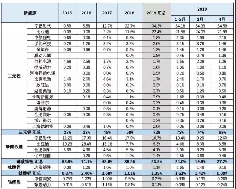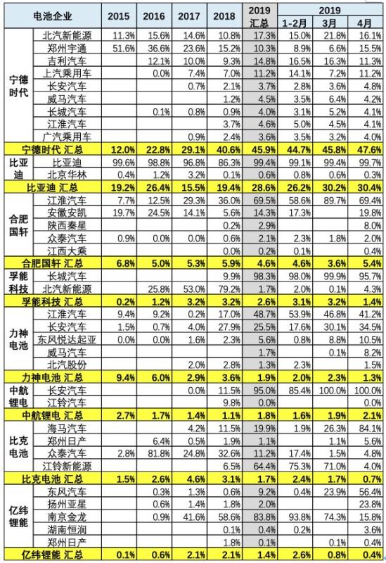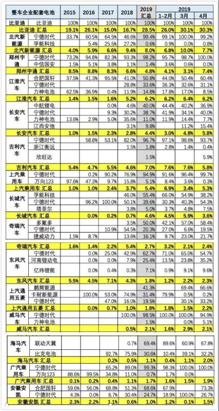 寧德時(shí)代上市前后很強(qiáng),1-4月也很優(yōu)秀,達(dá)到48%。而比亞迪的電池需求也比2018年大幅增長(zhǎng),份額達(dá)到30%,這也是客車的體系支撐。