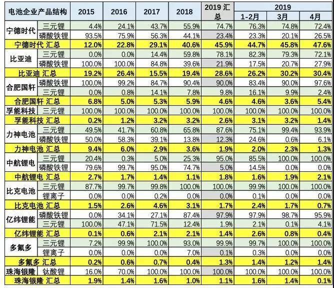 2018年磷酸鐵鋰占比46%,2019年是86%,且4月是96%,磷酸鐵鋰恢復(fù)增長(zhǎng)現(xiàn)象較明顯。