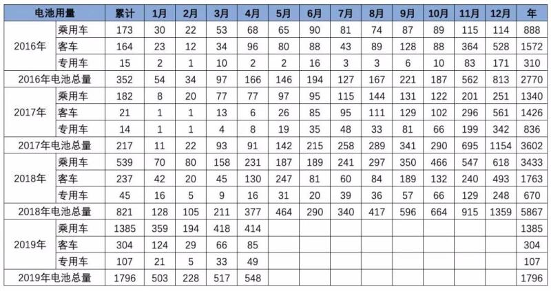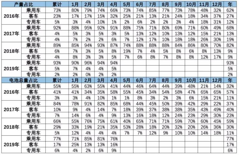 2019年4月的乘用車總體占產(chǎn)量需求的94%和電池需求的76%,仍是引領(lǐng)消費(fèi)增長(zhǎng)的核心動(dòng)力。