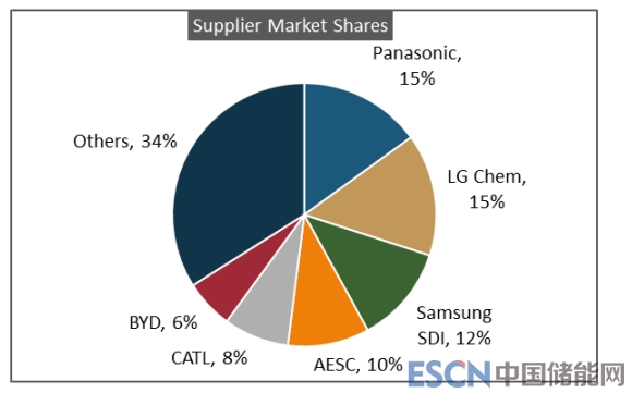 從供應(yīng)角度來看,亞洲制造商占據(jù)主導(dǎo)地位,LG Chem(韓國)、松下(日本)、三星SDI(韓國)、AESC(日本)、比亞迪(中國)和寧德時(shí)代(中國)占有約三分之二的市場份額。然而,為了減少對亞洲電池制造商的依賴,越來越多的企業(yè)尋求在歐洲獲得電池產(chǎn)品。德國BMZ集團(tuán)和瑞典Northvolt等公司正在建立新的或擴(kuò)大現(xiàn)有的制造設(shè)施,以滿足歐洲鋰離子儲能解決方案不斷增長的需求。下圖顯示了2017年各個(gè)生產(chǎn)制造商的市場份額: