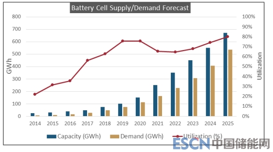 盡管對電池的需求不斷增加,但電池單元制造能力的利用率相對較低。在全球范圍內(nèi),電池生產(chǎn)工廠的利用率為60-70%。隨著電動汽車和電網(wǎng)儲能需求的增加,這一點(diǎn)在未來有望得到改善。然而,考慮多個(gè)大規(guī)模電池生產(chǎn)工廠開通運(yùn)營,預(yù)計(jì)最大利用率將保持在80%以下,如下圖所示。