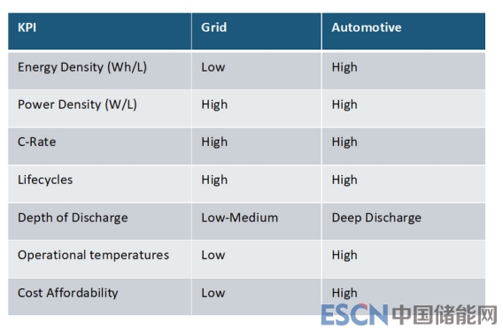 下表比較了電網(wǎng)和汽車行業(yè)的電池需求。幾乎在所有情況下,汽車行業(yè)比電網(wǎng)更嚴(yán)格的要求。這表明同樣的電池技術(shù)也可以用于電網(wǎng)領(lǐng)域,從而避免從零開始投入大量的研發(fā)成本。
