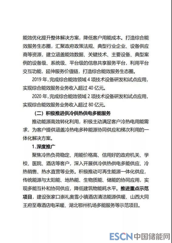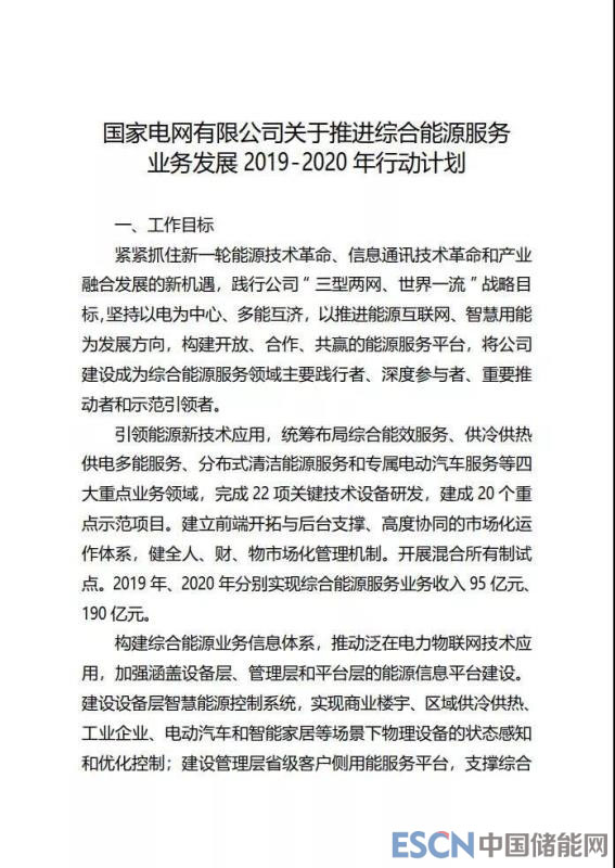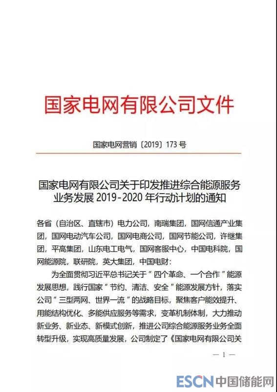 中國(guó)儲(chǔ)能網(wǎng)訊:近日,國(guó)家電網(wǎng)有限公司正式印發(fā)《推進(jìn)綜合能源服務(wù)業(yè)務(wù)發(fā)展2019-2020年行動(dòng)計(jì)劃》,根據(jù)《行動(dòng)計(jì)劃》,國(guó)家電網(wǎng)未來兩年將緊緊抓住新一輪能源技術(shù)革命、信息通訊技術(shù)革命和產(chǎn)業(yè)融合發(fā)展的新機(jī)遇,踐行公司“三型兩網(wǎng)、世界一流”戰(zhàn)略目標(biāo),堅(jiān)持以電為中心、多能互濟(jì),以推進(jìn)能源互聯(lián)網(wǎng)、智慧用能為發(fā)展方向,構(gòu)建開放、合作、共贏的能源服務(wù)平臺(tái),將公司建設(shè)成為綜合能源服務(wù)領(lǐng)域主要踐行者、深度參與者、重要推動(dòng)者和示范引領(lǐng)者。