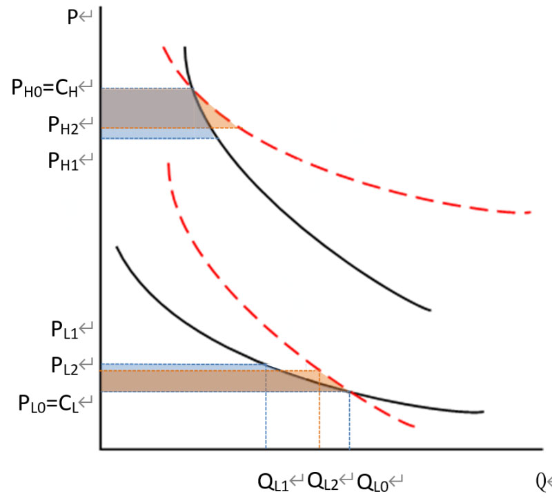 PL1和PH1是“上開口型”交叉補(bǔ)貼執(zhí)行后的電價(jià)水平,上述結(jié)果表明,在消費(fèi)者剩余等量增加(或減少)的條件下,“上開口型”交叉補(bǔ)貼導(dǎo)致的電價(jià)扭曲比“下開口型”交叉補(bǔ)貼導(dǎo)致的電價(jià)扭曲更為嚴(yán)重。