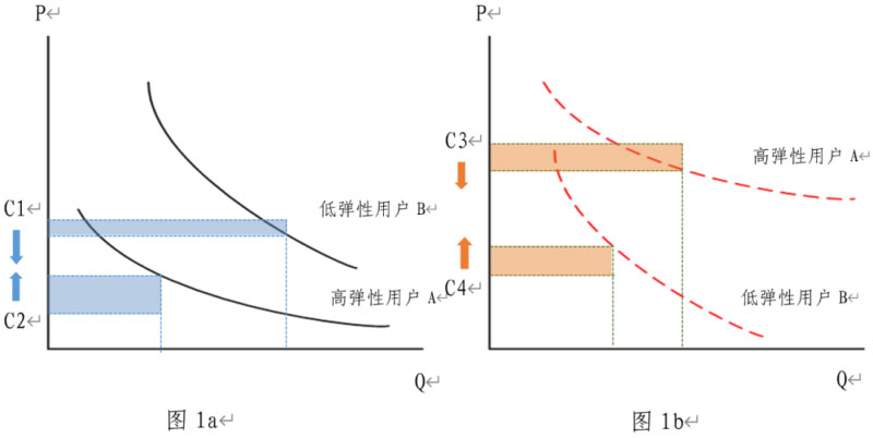 需求曲線的斜率和相對(duì)位置確定后,上述兩類電價(jià)交叉補(bǔ)貼在量?jī)r(jià)坐標(biāo)系中的“開口”形態(tài)就被固定下來(lái),如圖1所示:高彈性用戶向低彈性用戶支付交叉補(bǔ)貼時(shí),生產(chǎn)者剩余增減的絕對(duì)值相等(藍(lán)色陰影面積),兩條需求曲線圍成了向上開口的形態(tài),可稱之為“上開口型”電價(jià)交叉補(bǔ)貼(圖1a);低彈性用戶向高彈性用戶支付交叉補(bǔ)貼時(shí),生產(chǎn)者剩余增減的絕對(duì)值也相等(紅色陰影面積),兩條需求曲線圍成了向下開口的形態(tài),可稱之為“下開口型”電價(jià)交叉補(bǔ)貼(圖1b)。