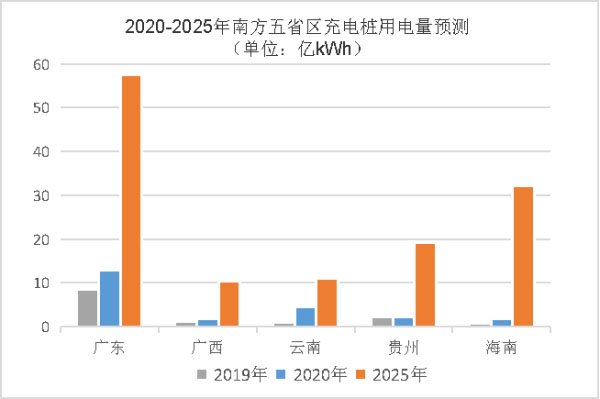 充電服務業(yè)的用電量也將快速增長。按照規(guī)劃,2020年電動汽車推廣應用城市電動汽車與公共充電樁比例不應高于8:1,2025年低于5:1,城市核心區(qū)公共充電服務半徑不超過1千米。在通過合理手段刺激市場、調(diào)節(jié)供需,市場發(fā)展穩(wěn)定的情況下,“十四五”期末,南方五省區(qū)的電動汽車推廣量將達到454萬輛,復合增長率為33.7%。預計在車樁比5:1的情景下,到2025年,南方五省區(qū)充電樁用電總量達到130億千瓦時,對全社會用電量增長的貢獻率約為2.5%。