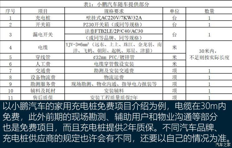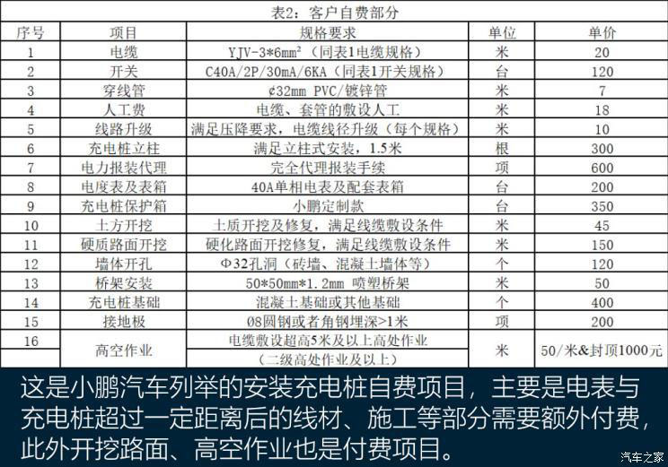小鵬汽車也在官網(wǎng)提供了家用充電樁的相關(guān)安裝指南,其提供的服務(wù)流程不算詳細(xì),但施工的免費(fèi)、付費(fèi)項(xiàng)目列舉的十分詳細(xì),有安裝充電樁需求的消費(fèi)者可以作為參考。要額外提示的是,不同品牌的同一服務(wù)項(xiàng)目可能費(fèi)用不同,以同一規(guī)格的電纜為例,愛(ài)馳汽車收費(fèi)為40元/米,而小鵬汽車收費(fèi)僅為20元/米,所以具體施工、耗材費(fèi)用還要以我們實(shí)際充電樁供應(yīng)商的收費(fèi)規(guī)則為準(zhǔn)。