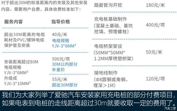 在充電樁安裝費(fèi)用方面,愛(ài)馳汽車與吉利新能源的收費(fèi)標(biāo)準(zhǔn)基本相同,若電表到充電樁超出30m安裝距離及標(biāo)準(zhǔn)安裝內(nèi)容,超出部分的費(fèi)用由用戶自行承擔(dān)。如果你也有像許博老師一樣的需求,即增加充電樁到充電槍的線束長(zhǎng)度,相信也是付費(fèi)項(xiàng)目,具體可以向施工方咨詢。
