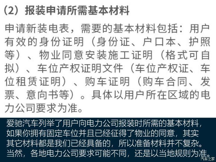 如果家中電力容量不足,愛(ài)馳建議可以向國(guó)家電網(wǎng)或南方電網(wǎng)申請(qǐng)安裝獨(dú)立電表,即在“網(wǎng)上國(guó)網(wǎng)App”或“南方電網(wǎng)App”中選擇充電樁報(bào)裝或低壓報(bào)裝,申請(qǐng)過(guò)程中需要用戶提交相關(guān)證明材料,其中包括用戶身份證明、物業(yè)同意安裝證明、車位產(chǎn)權(quán)證明以及購(gòu)車證明等。