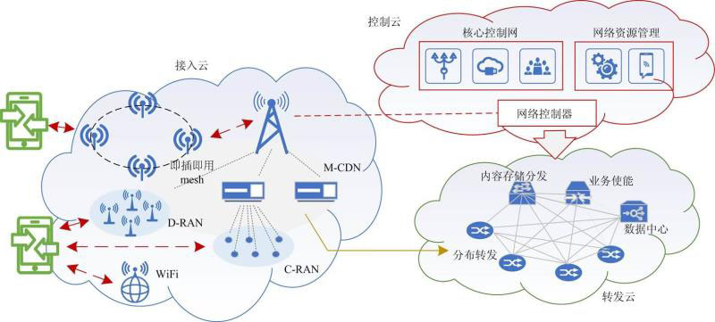 如圖4所示,5G網(wǎng)絡(luò)架構(gòu)可分為三個部分,分別為接入云、轉(zhuǎn)發(fā)云和控制云。接入云適應(yīng)各種無線鏈路接入,可實現(xiàn)高效的數(shù)據(jù)感知,網(wǎng)絡(luò)拓撲豐富,有著集中式接入和分布式接入兩種接入架構(gòu)。轉(zhuǎn)發(fā)云在控制云的控制下,實現(xiàn)數(shù)據(jù)的低時延高效傳輸??刂圃瓶刂迫值男畔⒐芾聿⒈WC5G通信服務(wù)質(zhì)量,根據(jù)業(yè)務(wù)不同提供不同的差異化服務(wù),保證每個業(yè)務(wù)對象的需求。
