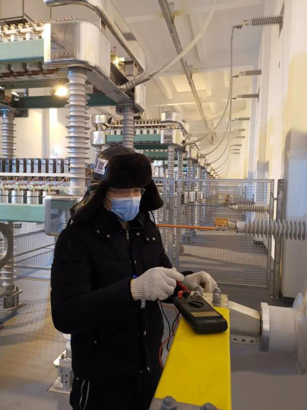張北柔直工程張北換流站林宇龍對系統(tǒng)調(diào)試前接觸電阻開展測量工作。喬平 攝