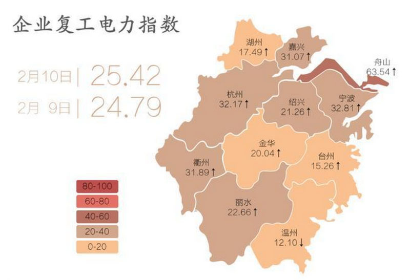 發(fā)電日均煤耗數(shù)據(jù)雖然可以從宏觀上觀察復(fù)工趨勢,但是該數(shù)據(jù)沒有加權(quán)處理,且未考慮到新能源發(fā)電因素,可作為觀察企業(yè)復(fù)工復(fù)產(chǎn)的一個(gè)側(cè)面參考。近日,國網(wǎng)浙江電力綜合用電信息采集系統(tǒng)中企業(yè)歷史用電量情況、當(dāng)日用電量情況等數(shù)據(jù),率先構(gòu)建企業(yè)復(fù)工電力指數(shù),用可視化的形式呈現(xiàn)浙江省復(fù)工狀況,受到省委、省政府的高度肯定。