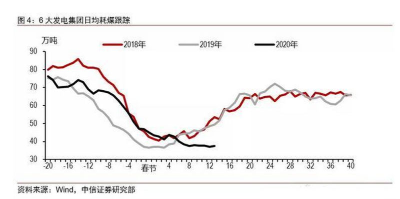 用電量數(shù)據(jù)是經(jīng)濟(jì)社會(huì)的晴雨表,能夠真實(shí)地反映當(dāng)前生產(chǎn)生活的電能消耗,從而可以準(zhǔn)確地表征宏觀經(jīng)濟(jì)的脈搏跳動(dòng)。6大發(fā)電集團(tuán)日均煤耗數(shù)據(jù),是衡量企業(yè)復(fù)工的指標(biāo)之一。據(jù)統(tǒng)計(jì),一般春節(jié)期間6大發(fā)電集團(tuán)日均煤耗維持在70萬~80萬噸,而春節(jié)停工期間在40萬噸左右,春節(jié)復(fù)工后恢復(fù)到60萬~70萬噸左右。2018年、2019年均在正月十五之后恢復(fù)正常,但今年受到疫情沖擊,較往年恢復(fù)較慢。