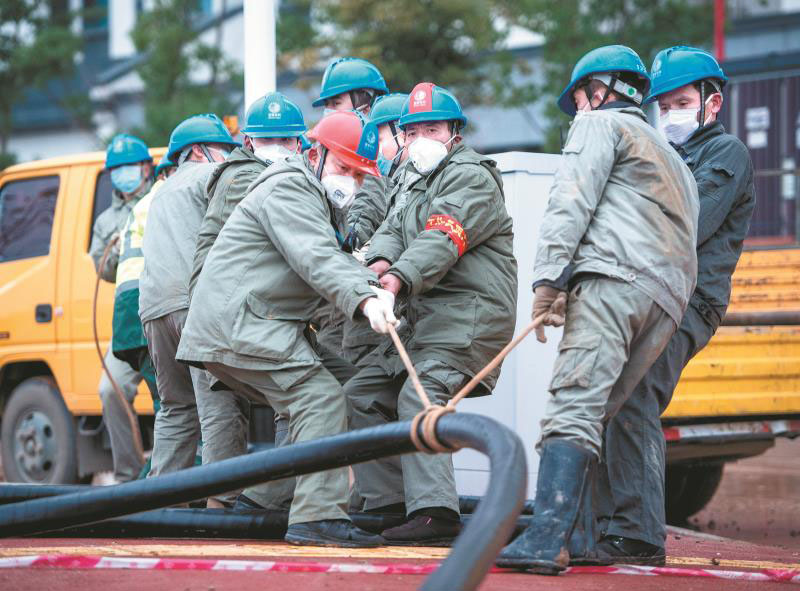 1月29日,供電員工在雷神山醫(yī)院建設(shè)工地敷設(shè)電纜。左衛(wèi)兵 攝