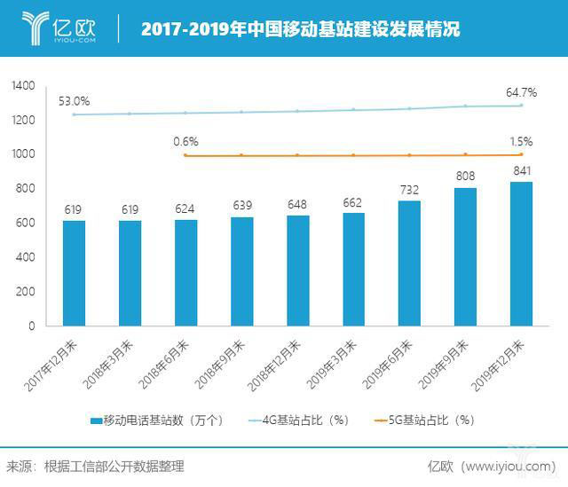 基站建設(shè)方面,根據(jù)工信部統(tǒng)計(jì)數(shù)據(jù),截至2019年底,中國新增基站174萬個(gè),基站總數(shù)超過841萬個(gè),其中4G基站占比64.7%,約為544萬個(gè),5G基站總數(shù)超過13萬個(gè)。雖然2019年基站建設(shè)仍以提升4G網(wǎng)絡(luò)覆蓋能力為主,5G基站總數(shù)占比不足2%,但作為5G網(wǎng)絡(luò)的建網(wǎng)初期,三大運(yùn)營商已經(jīng)紛紛加大了基站網(wǎng)絡(luò)投資。