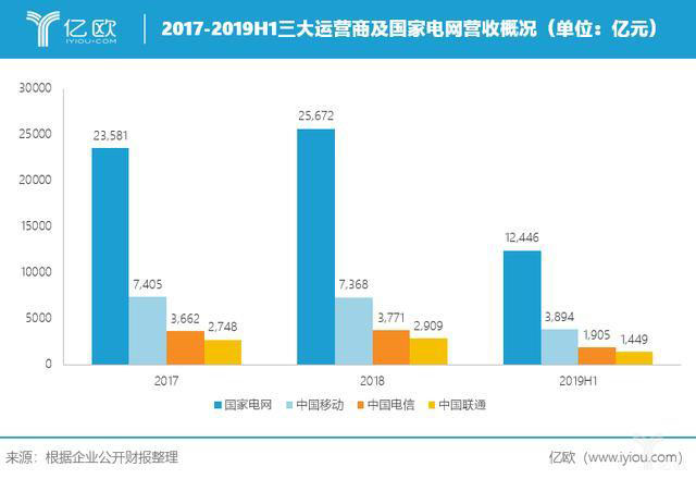 其次,從營收來看,2018年中國移動(dòng)、中國電信、中國聯(lián)通三家運(yùn)營商全年?duì)I收分別為7368億元、3771億元和2909億元,而國家電網(wǎng)2018年全年?duì)I收則達(dá)到了25672億元,營收體量遠(yuǎn)超三大運(yùn)營商之和。
